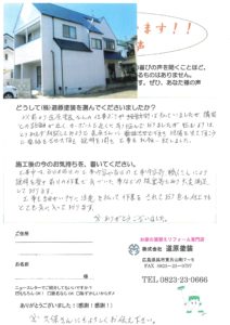 以前より道原塗装さんの仕事ぶりは知っていましたが、隣家との距離が近くカーポートも近くに有り悩んでおりましたが悩むよりは、とりあえず相談してみようと道原さんに現場を見て頂こうと電話をさせて頂き説明を聞き工事をお願いいたしました。