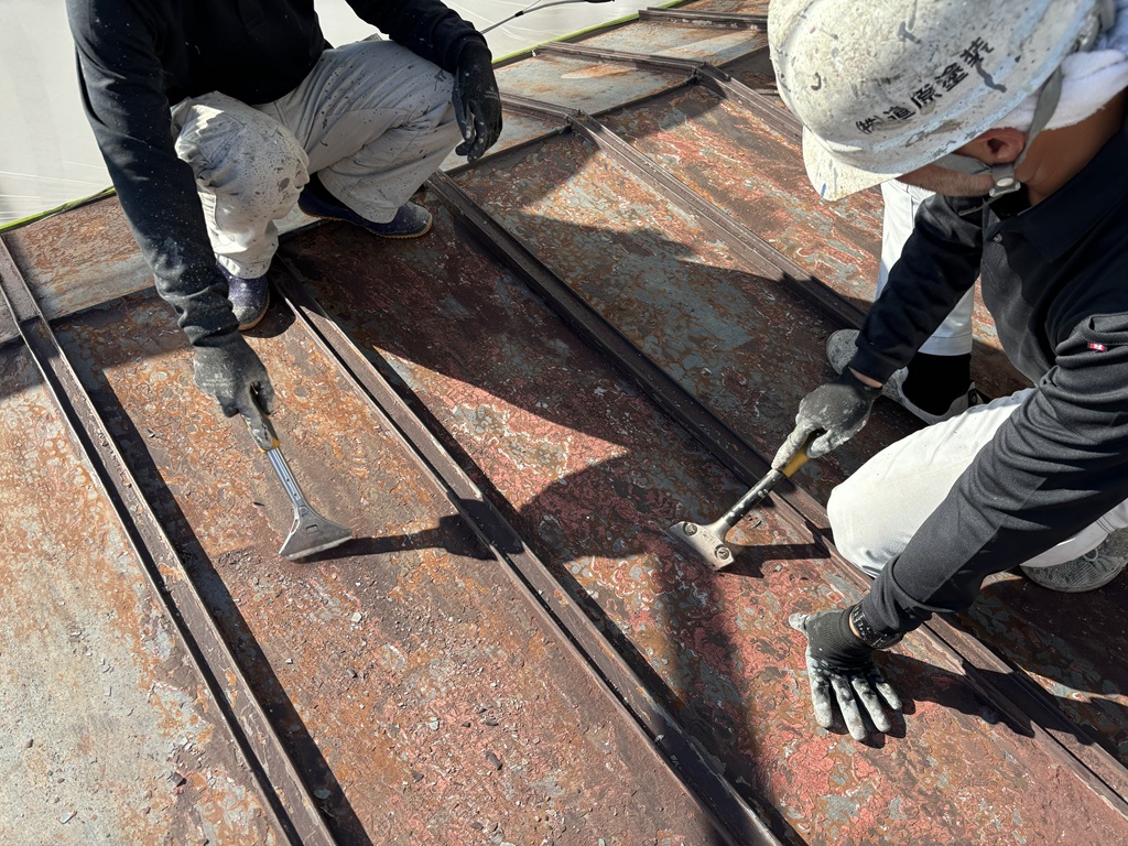 現場親方ブログ2025年12月上山田町T様邸 屋根塗替えリフォームを行っています。施工状況上山田町で瓦棒屋根塗替えリフォームが始まりました。旧塗膜がバリバリと剥がれている状態でしたので手工具と電動工具を駆使して丁寧に下地処理をしています。瓦棒屋根の塗り替えでは、この下地処理作業をしっかりと行うことが長持ちする施工にとって非常に重要です。手間を惜しまずに、きっちり丁寧に進めていきますよ!塗替えをお考えの方は、ぜひ塗装職人専門店の道原塗装をお尋ねください。無料お見積はこちら