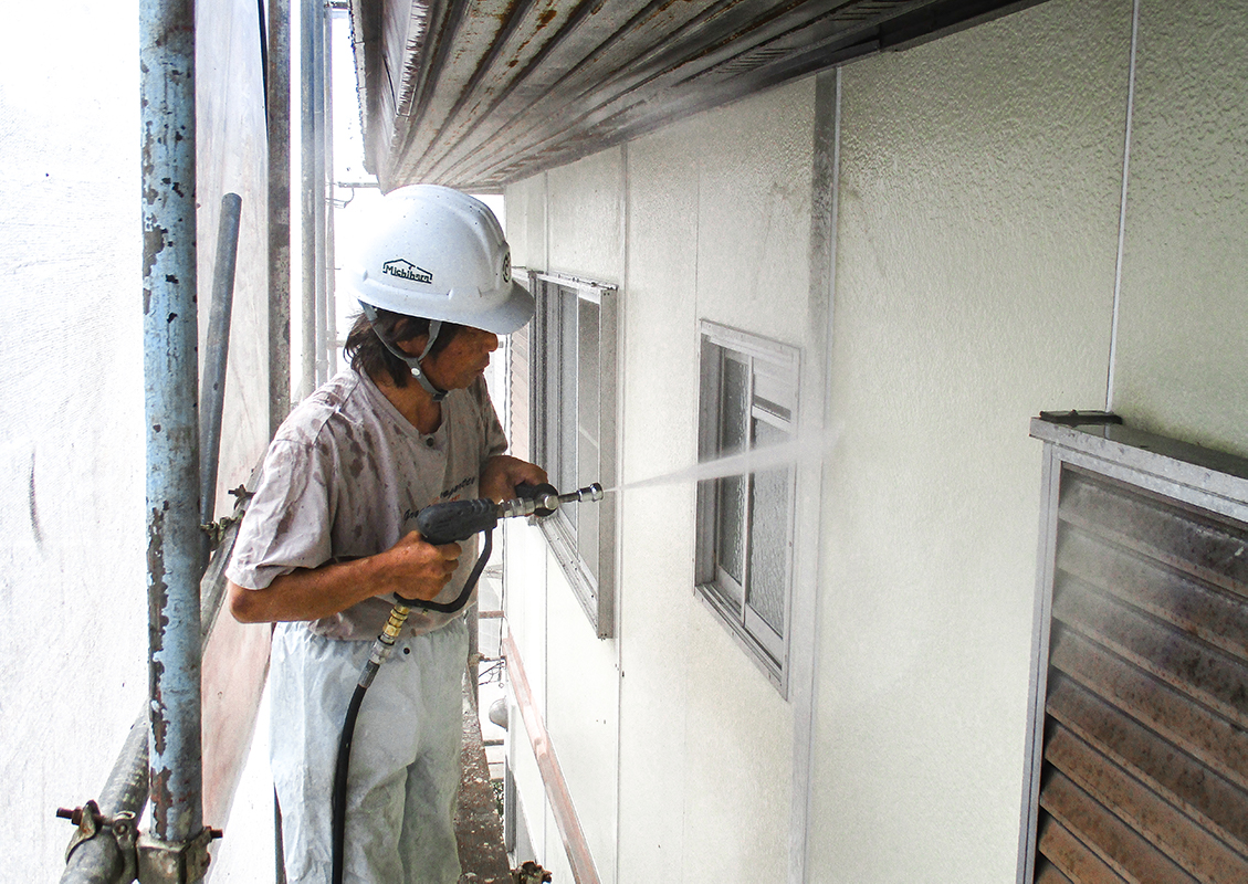足場設置後、外壁や屋根の高圧洗浄を行います。汚れやカビを徹底的に除去し、塗装の密着性を高めます。洗浄作業は入居者様の生活への影響を考慮し、適切な時間帯に実施します。