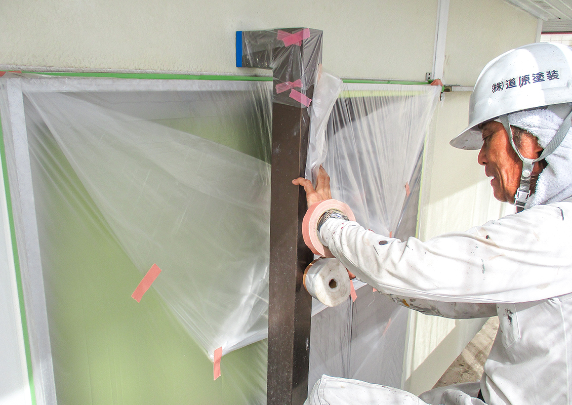 窓や玄関、エアコンの室外機、共用階段、手すりなど、塗装不要な部分を保護する養生作業を行います。入居者様の出入りに配慮し、必要に応じて通行可能なスペースを確保します。